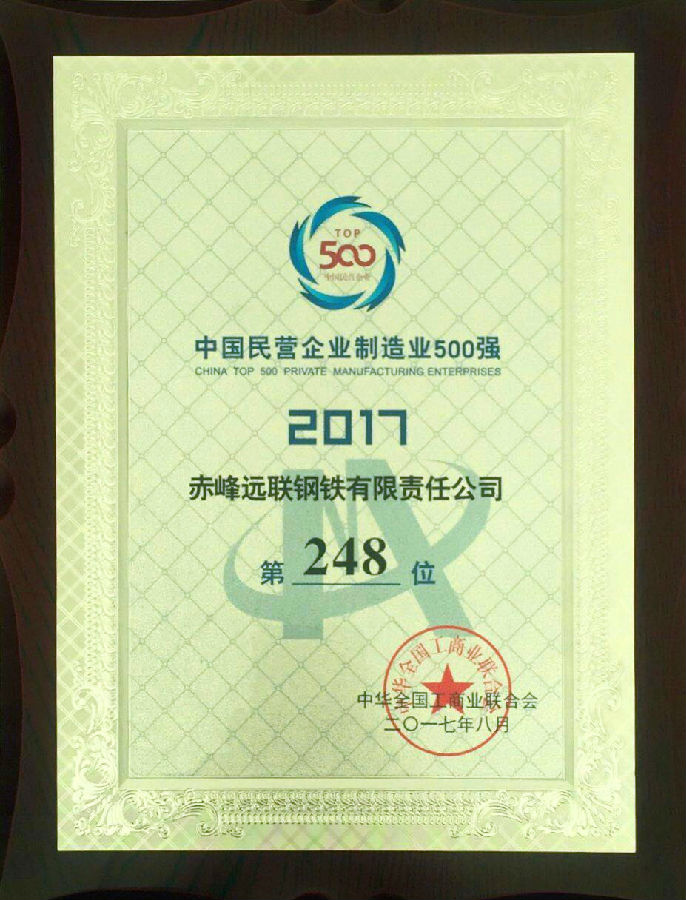 2017年8月,公司被中國工商聯(lián)評(píng)為“中國民營企業(yè)500強(qiáng)第431位”